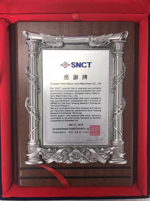 近日,海西重機收到來自韓國仁川新港鮮光新港集裝箱碼頭(SNCT)總裁李道熙代表SNCT授予的“感謝牌”,對海西重機在2017年和2018年兩個自動化項目中的優(yōu)秀表現(xiàn)給予高度認可,對海西所交付設備在碼頭發(fā)展中起到的重要作用表示感謝。